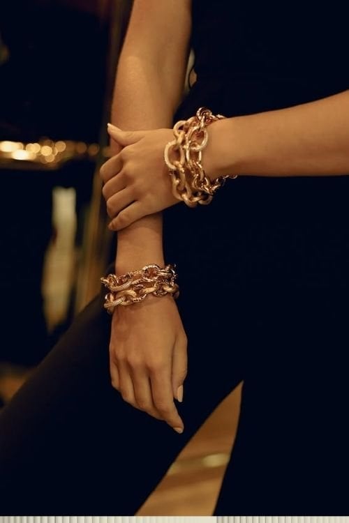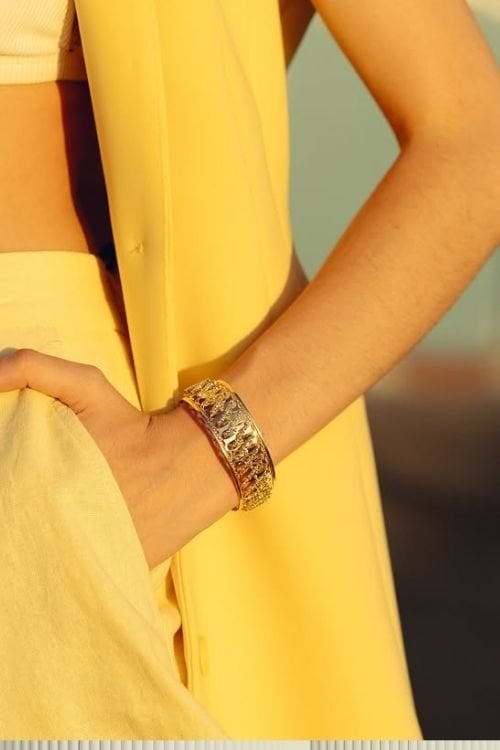 Toprak tonlarının hâkim olduğu kombinlerde gold bileklik tercih etmek bohem ruhu desteklerken; koyu renkli kombinlerde daha sade zincir bileklik modelleri ön plana çıkar. Burada önemli olan, zincirin çok parlak ve sert bir görünüme sahip olmamasıdır.
